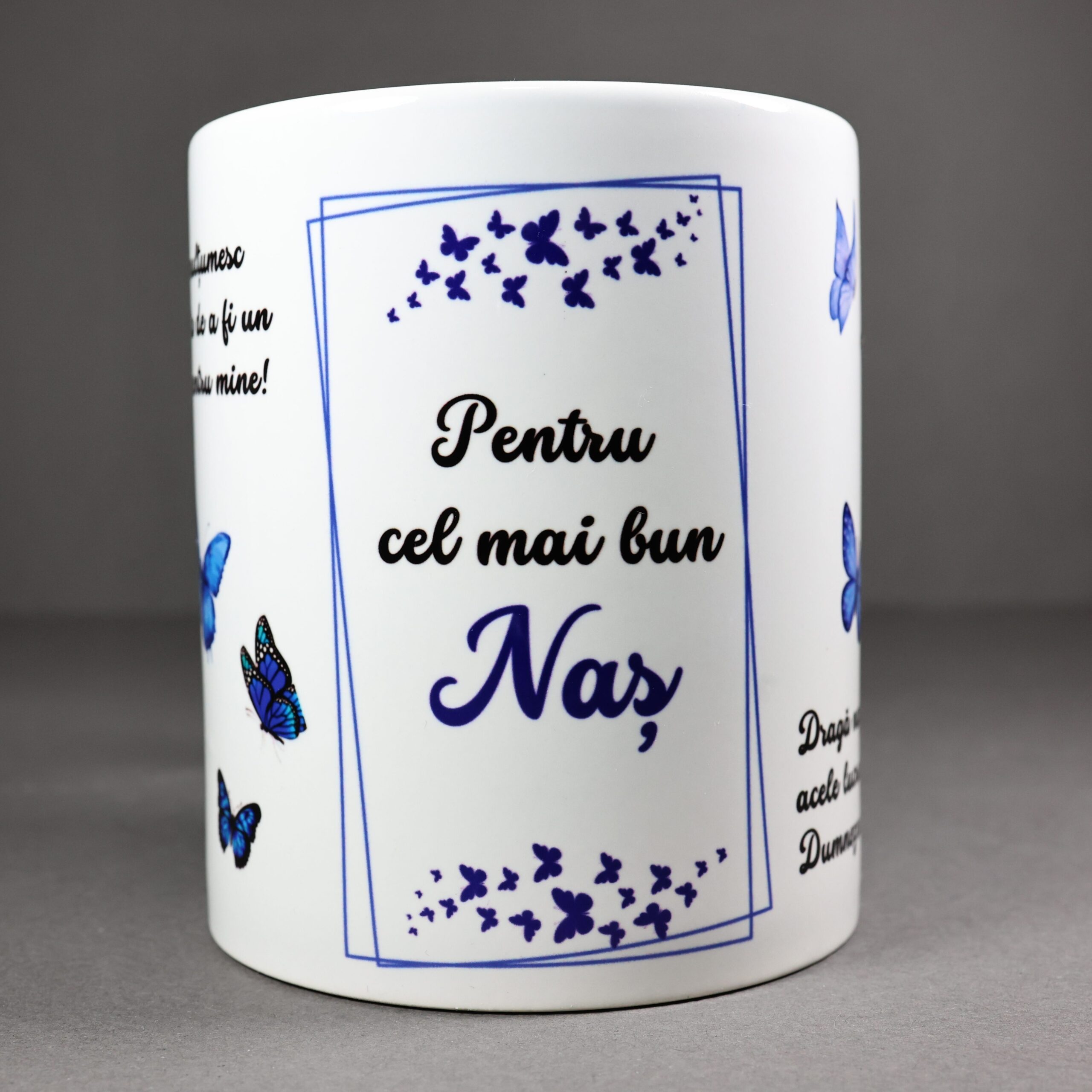Această cană spune o poveste despre legătura specială dintre fin și naș. Decorată cu fluturi în nuanțe de albastru, simbol al protecției și al încrederii, cana este mai mult decât un obiect – este un mesaj de suflet.