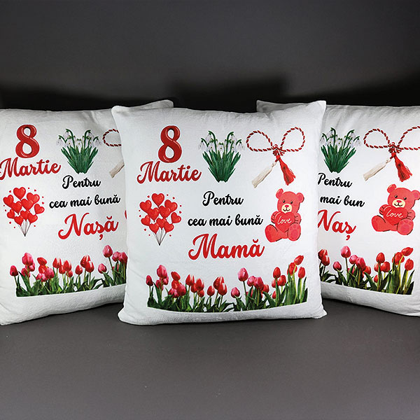 Pernă decorativă pătrată, din material plușat tip cocolino, cu design dedicat Zilei Femeii. Cadoul poate fi dăruit mamei, nașei, bunicii sau oricărei femei dragi din viața ta. Un gest cald și plin de emoție, perfect pentru 8 Martie.