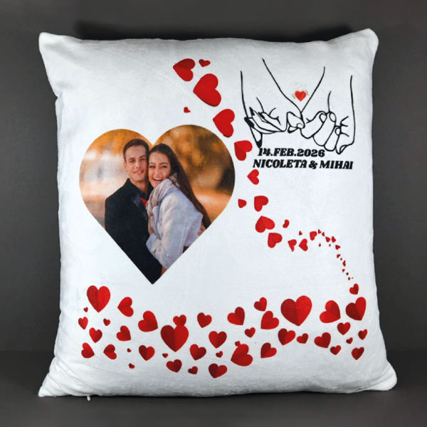 Pernă decorativă din material plușat tip cocolino, personalizată cu fotografie, numele celor doi îndrăgostiți și o dată specială pentru ei. Un cadou romantic, creat pentru a păstra aproape momentele care spun o poveste de iubire, fie de Ziua Îndrăgostiților, fie atunci când vrei să surprinzi persoana iubită fără o ocazie anume.