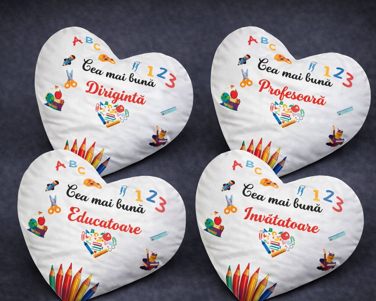 Designul vesel cu elemente școlare (ABC, creioane, cifre) face ca această pernă să fie un cadou ideal pentru finalul anului școlar sau pentru a spune „Mulțumesc” unui cadru didactic.