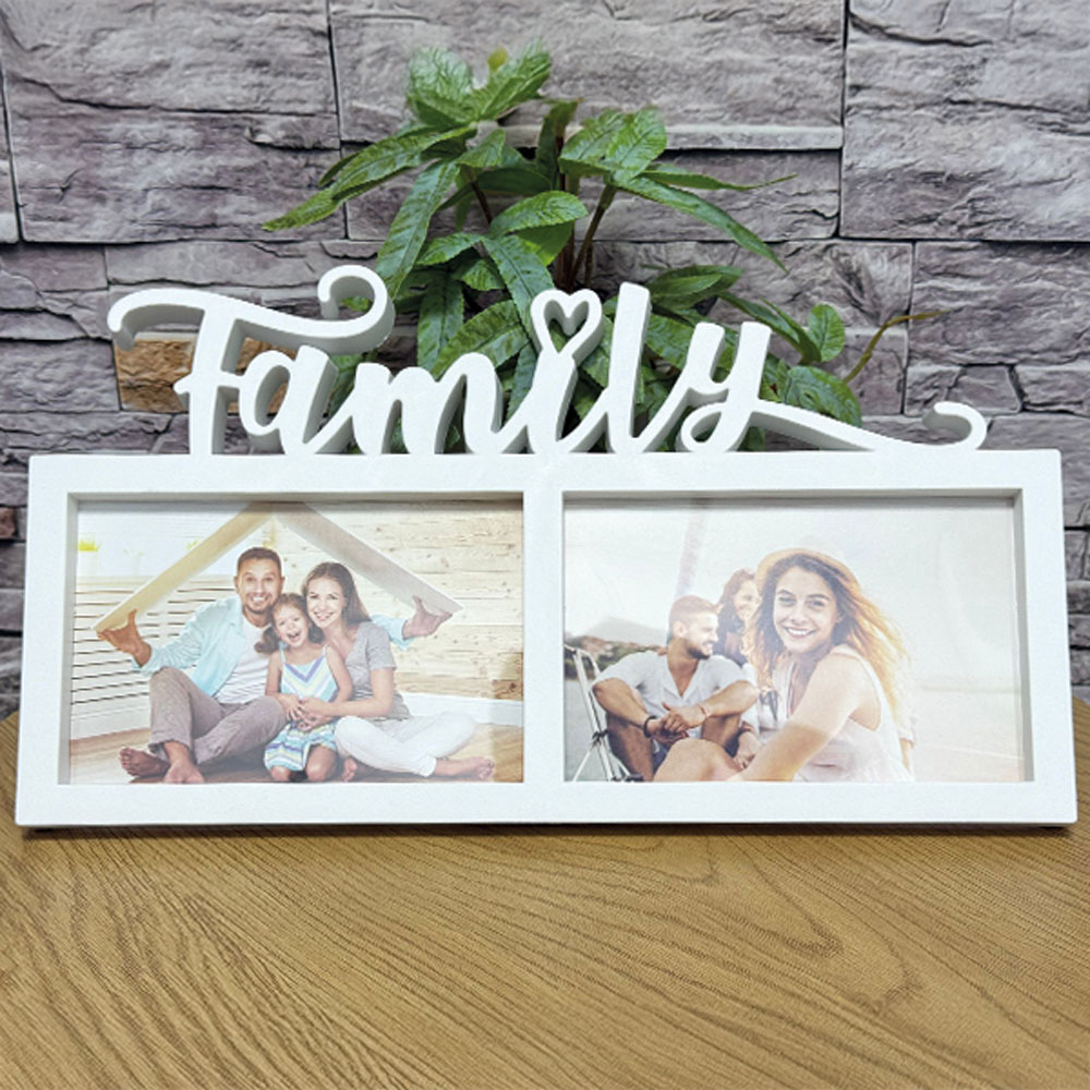 Ramă foto decorativă cu mesajul „Family”, concepută pentru a aduce împreună două momente care definesc legătura dintre cei dragi. Designul cald și echilibrat o transformă într-un element de decor discret, potrivit pentru orice încăpere, fiind o alegere inspirată pentru a celebra familia și amintirile create împreună.