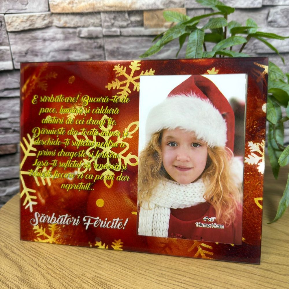 Ramă foto din sticlă cu tematică de Crăciun, realizată pentru a evidenția o fotografie dragă într-un decor festiv bogat și expresiv. Urarea de sărbători integrată în design adaugă profunzime și emoție, transformând rama într-o piesă decorativă caldă.