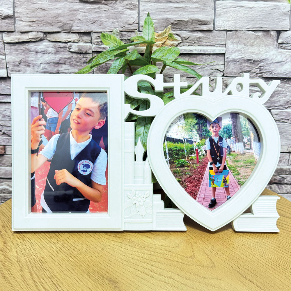Ramă foto decorativă cu mesajul „Study”, creată pentru a evidenția două momente importante din parcursul educațional al copilului. Designul modern și echilibrat o face potrivită pentru birou sau camera de studiu, fiind un mod inspirat de a păstra aproape amintiri legate de școală, reușite și evoluție personală.